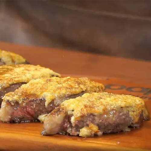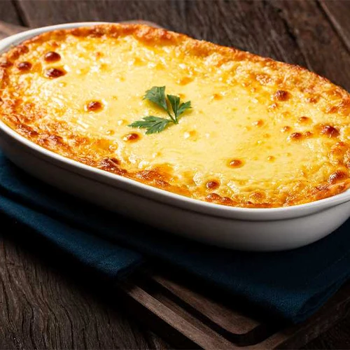 Servido com molho branco e gratinado com queijo. Acompanha: arroz branco e farofa de maracujá. Serve 03 pessoas.
